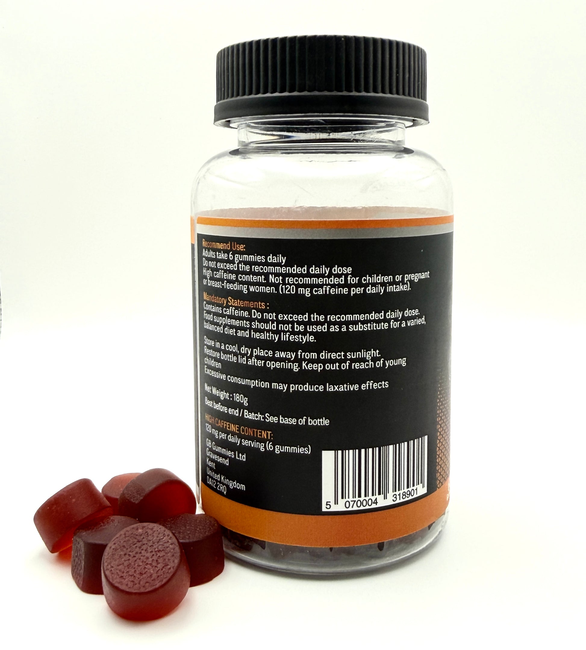 6 gummies provide 120mg of caffeine. For Adults seeking a controlled caffeine alternative to coffee/ energy drinks