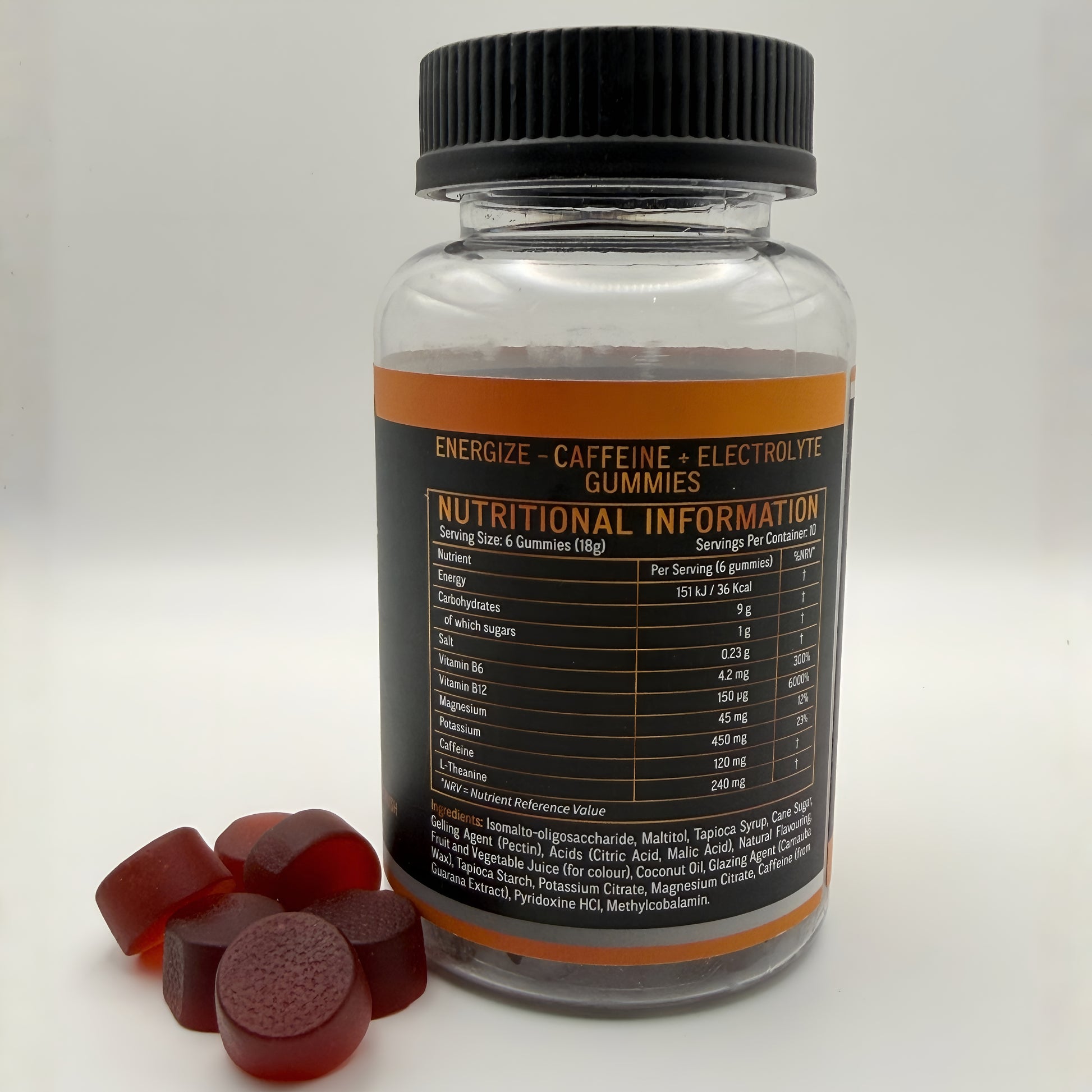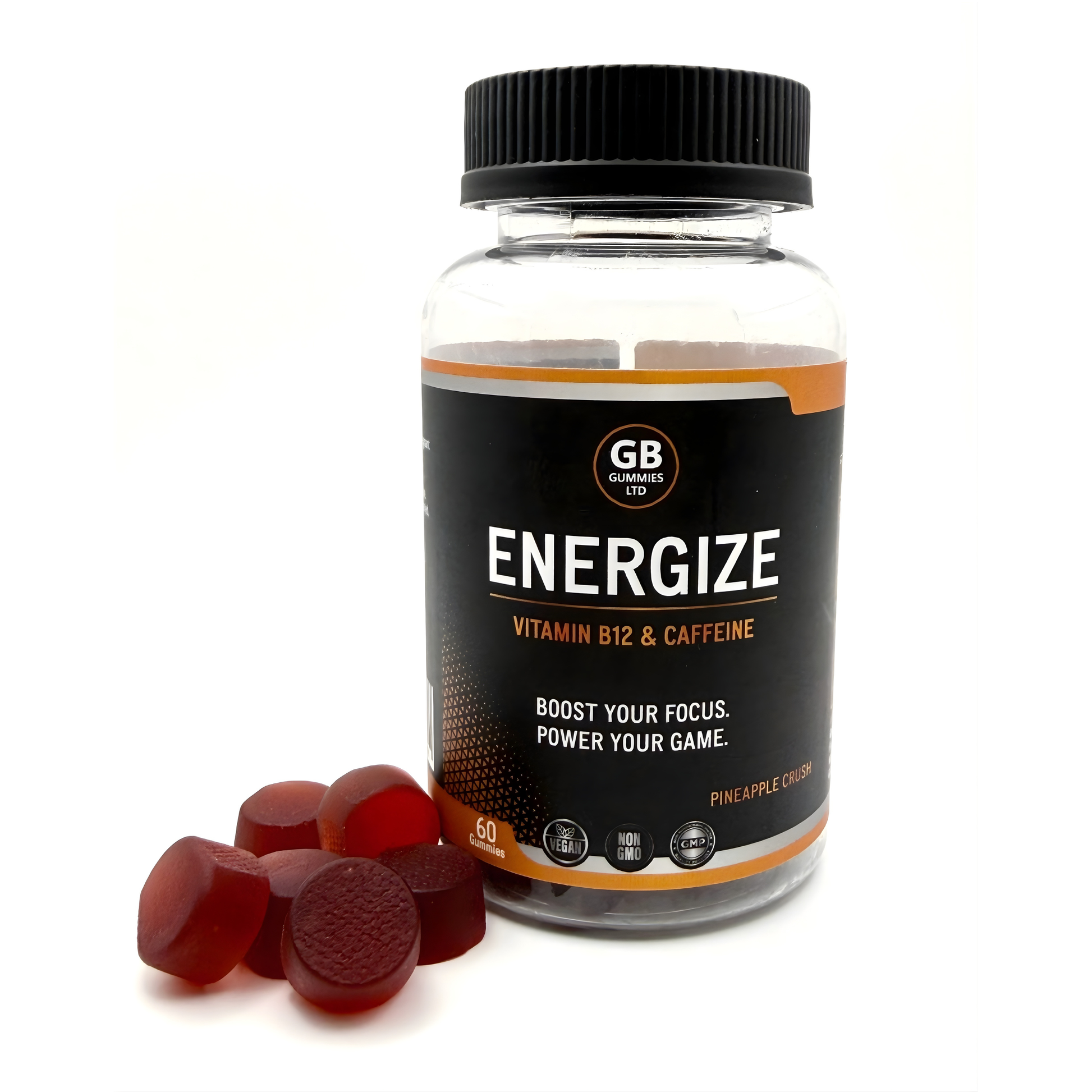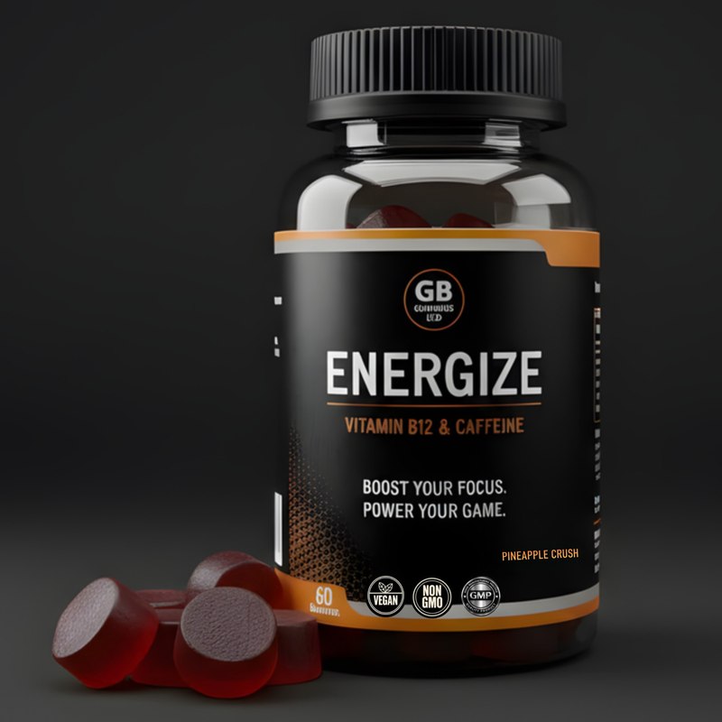 ENERGIZE is a convenient caffeine gummy designed to support energy, focus, and alertness throughout the day. Each bottle contains 60 gummies (180g), offering an easy and enjoyable alternative to traditional caffeine sources.